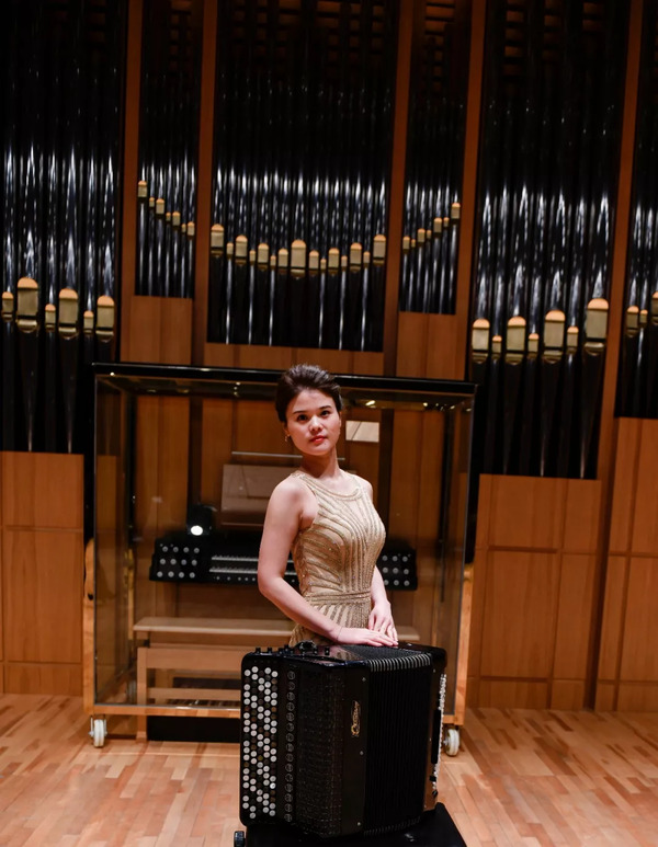 流行音樂系青年教師吳雯怡懷抱巴揚,十指躍動,左臂輕舒拉動風(fēng)箱,臉露優(yōu)雅自信的笑容。柔緩的弦樂烘托著巴揚流動的旋律,而巴揚的獨特音色映襯著歌手的深情婉唱,珠聯(lián)璧合,將此曲娓娓道來。