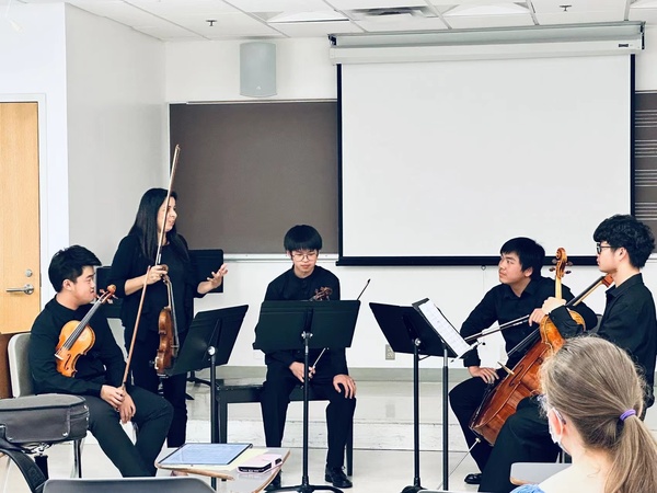 提及此次音樂節(jié)和藝術(shù)交流的收獲與感受,“繁星四重奏”談到:“通過演奏課程,老師會強調(diào)和聲變化與音色的關(guān)聯(lián),針對不同樂段的難點給予細致的指法建議,幫助我們在演奏中選擇音色處理。這種教學(xué)思維不僅能高效地提升演奏技巧,更能讓我們準(zhǔn)確地把握和理解音樂的內(nèi)涵與表達。此外,老師也會特別講解運弓的放松以達到對力度和音符表現(xiàn)等的控制,從而獲得聲音的立體感,以及如何換把使主題表現(xiàn)更加連貫等。”“繁星四重奏”期待將此次交流所學(xué)到的知識運用到日后的演出中,不斷追求更高的藝術(shù)境界,創(chuàng)造出屬于他們的音樂之聲。