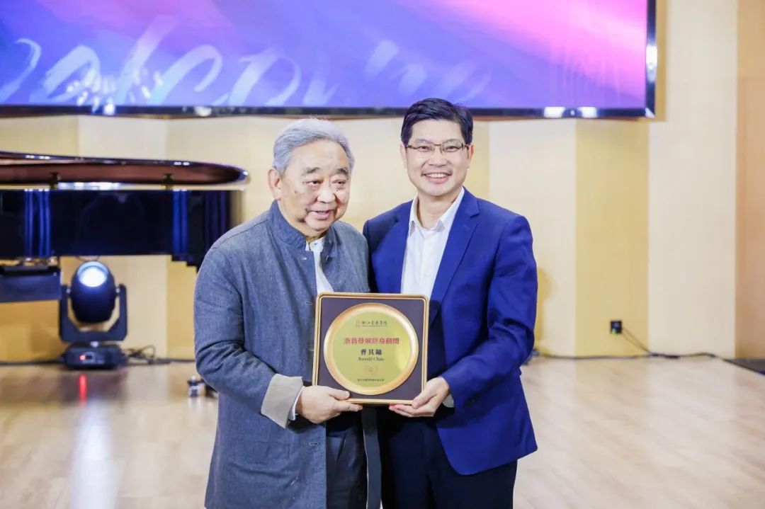 歡迎儀式上,干武東書記向曹其鏞先生頒發(fā)“浙音發(fā)展終身顧問”榮譽(yù)牌匾,并贈(zèng)送了由學(xué)院國(guó)樂系師生精心灌制的作品精選集《八音賦》黑膠唱碟。