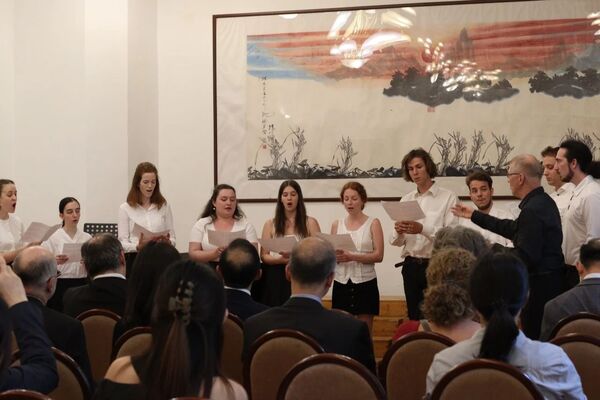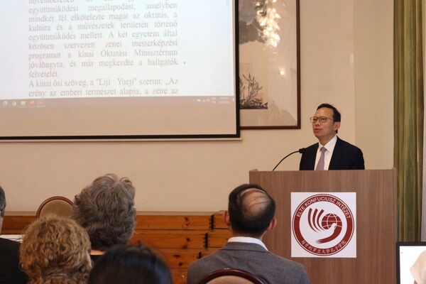 訪問羅蘭大學(xué)期間,兩校合作共建的“中國音樂文化中心”正式揭牌。中國駐匈牙利大使龔韜、羅蘭大學(xué)校長薄慕往(László Borhy)、副校長郝清新(Imre Hamar)、使館孫杰參贊,以及中匈友好人士80余人出席。羅蘭大學(xué)合唱團(tuán)和浙音師生為現(xiàn)場嘉賓獻(xiàn)上了精彩的藝術(shù)表演。