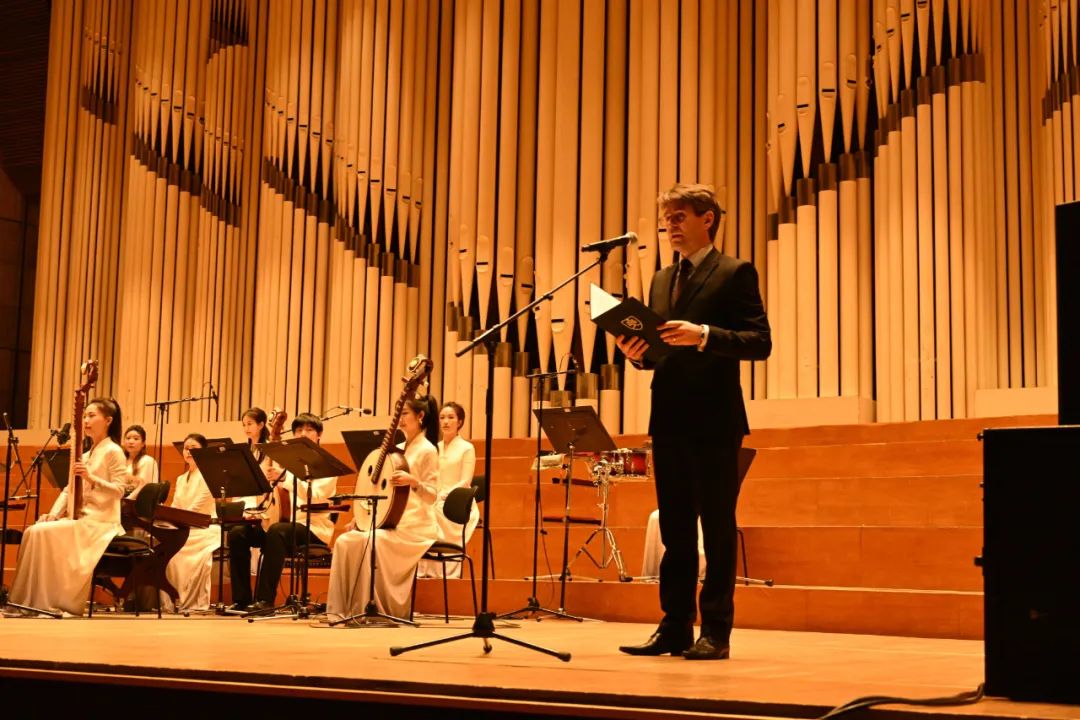 2月3日晚,中國駐捷克大使館在具有百年歷史的中信歐洲控股總部大樓宴會廳舉辦2024年春節(jié)招待會,浙音民族室內(nèi)樂團為現(xiàn)場的旅捷華人華僑、中資企業(yè)人員、孔子學院教師、留捷學者和學生代表等近400人表演了古箏獨奏《漁舟唱晚》、二胡曲《賽馬》、琵琶獨奏《十面埋伏》等中國經(jīng)典民樂。
