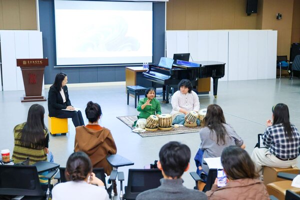 Bivakar Choudhury教授帶來的印度塔布拉鼓工作坊同樣精彩。他從印度塔布拉鼓的由來講起——羊皮蒙面、雙音變幻,娓娓道出鼓樂與信仰的千年淵源。隨后,他講述了印度音樂中獨具魅力的“汀塔拉”節(jié)奏,引領(lǐng)學(xué)員步入那片色彩斑斕、充滿異域風景的韻律秘境。在互動環(huán)節(jié),他帶領(lǐng)學(xué)生嘗試擊打出陌生卻迷人的節(jié)拍,仿佛跟隨時光的駝鈴,踏上了一場穿越絲路的音樂之旅。“這個工作坊像一場文化的探險,讓我們在節(jié)奏的縫隙中,聆聽不一樣的東方智慧,感受音樂與天地的共鳴回響。”