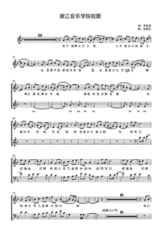 第七十四條 學校校歌為《浙江音樂學院校歌》,由李嵐清作詞、徐孟東作曲。