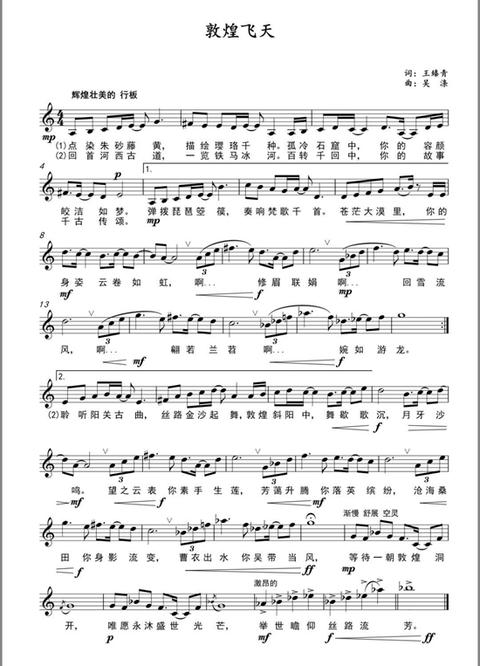 《敦煌飛天》由中國音樂家協(xié)會(huì)會(huì)員、浙江音樂學(xué)院副教授吳滌作曲。他是一位蒙古族青年作曲家、合唱指揮、民族音樂學(xué)者、文化與旅游部畬族民歌搶救性項(xiàng)目藝術(shù)顧問、2019年度國家藝術(shù)基金項(xiàng)目《彩帶獻(xiàn)北京》負(fù)責(zé)人。多年來,他積極致力于“一帶一路”沿線及中外各民族民間音樂的傳承發(fā)展、創(chuàng)新創(chuàng)作與藝術(shù)實(shí)踐傳播。吳滌在為《敦煌飛天》譜曲時(shí),綜合運(yùn)用了多種創(chuàng)作手法。在旋律設(shè)計(jì)方面,他采用了典型的七聲雅樂音階,優(yōu)雅精致,古韻濃郁。二度、三度的音程進(jìn)行,變徵音的出現(xiàn),使旋律親切質(zhì)樸、柔美順暢,朗朗上口。同時(shí)運(yùn)用了分解和弦上行跳進(jìn)的模進(jìn)式旋律寫作方式,形成壯麗恢宏的風(fēng)格特點(diǎn),色彩對(duì)比鮮明。其次,作品配器中綜合運(yùn)用了絲路沿線多種特色樂器及演奏技法,其中重點(diǎn)突出了古代絲路中國民族樂器的音色特點(diǎn)。再次,作品調(diào)式色彩變化多樣,其中副歌部分采用了大量的離調(diào)寫作手法,力求描繪出古代絲綢之路中敦煌藝術(shù)的萬千氣象與多元文化融合,表達(dá)了詞曲作者對(duì)中華優(yōu)秀傳統(tǒng)文化的無限敬仰與熱愛之情。