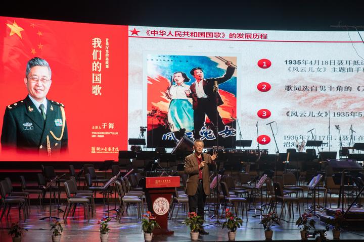 “我國(guó)的國(guó)歌有84個(gè)字,37個(gè)小節(jié),標(biāo)準(zhǔn)時(shí)長(zhǎng)是46秒,這是每一個(gè)中國(guó)人都應(yīng)該牢記的。”站在講臺(tái)上,年過六旬的于海依然身姿挺拔。11月18日下午,浙江音樂學(xué)院“音樂廳里的思政課”拉開帷幕。