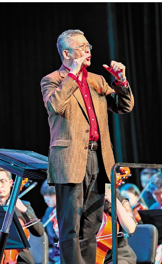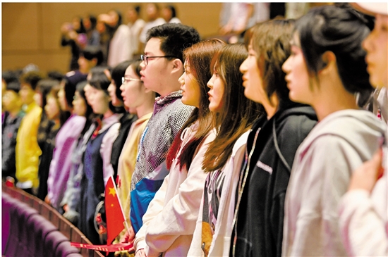 于海帶領(lǐng)浙江音樂學(xué)院師生齊唱《義勇軍進(jìn)行曲》。