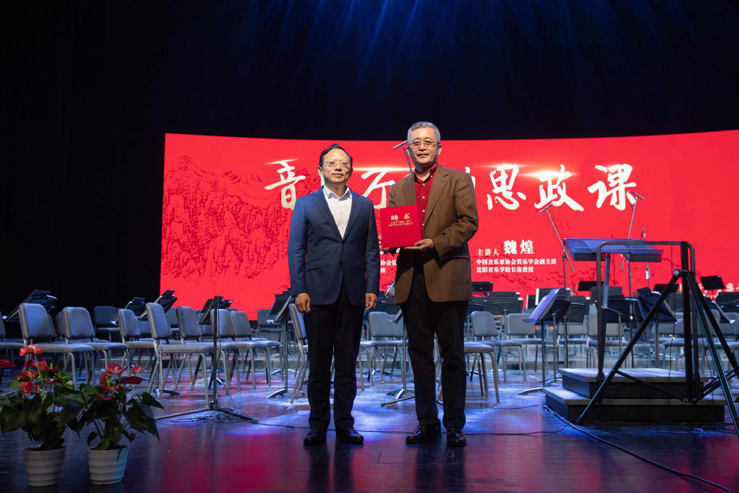 活動邀請了中國音樂家協(xié)會管樂學(xué)會主席、國家一級指揮、中國人民解放軍軍樂團(tuán)原團(tuán)長于海老師和中國音樂家協(xié)會管樂學(xué)會副主席、沈陽音樂學(xué)院原副院長魏煌老師,為師生分別帶來題為《我們的國歌》和《我和我的祖國》兩場學(xué)術(shù)講座?;顒蝇F(xiàn)場,浙江音樂學(xué)院校長王瑞為于海頒發(fā)學(xué)??妥淌谄笗?。
