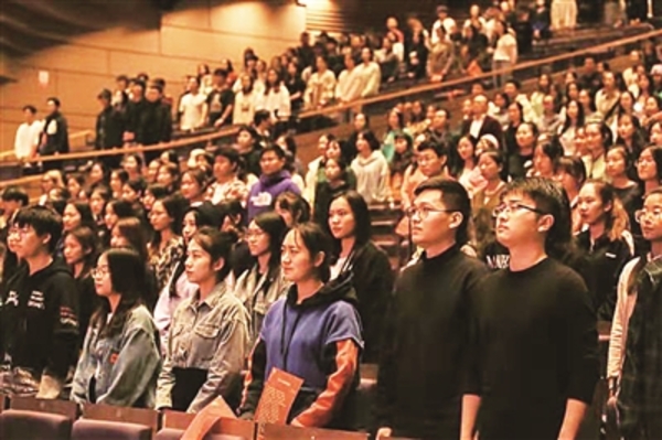 一個(gè)半小時(shí),講座結(jié)束,全體學(xué)生起立,在于海的現(xiàn)場(chǎng)指揮、交響樂(lè)隊(duì)的演奏下,700余名師生唱起了國(guó)歌,劇院內(nèi)激情澎湃,不少學(xué)生眼里噙著晶瑩的淚花。