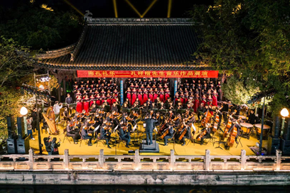 這次音樂會以孔氏南宗家廟舉行的祭祀儀式——南孔祭典作為貫穿全場的脈絡(luò)。南孔祭典在衢州延續(xù)800余年,曾一度中斷。2004年,由南宗嫡長孫孔祥楷倡議恢復(fù),2011年入選國家級非遺代表性項目名錄。為打造“百姓祭孔”“當(dāng)代人祭孔”特色,“以古人之規(guī)矩, 開自己之生面”,南孔祭典大膽革新,將祭祀儀式中的歌舞演出部分剝離,獨立為紀(jì)念晚會。孔祥楷還親自創(chuàng)作祭典音樂,將2000多年孔子文化與西方音樂的精髓相結(jié)合。音樂會為觀眾先后呈現(xiàn)了“大哉孔子”“南渡風(fēng)云”“有教無類”“孔洙讓爵”“彥繩復(fù)爵”“楷木圣像”“東南闕里”“浩浩中華”8首合唱作品,將孔子思想、南孔歷史、經(jīng)典典故等融入音樂作品,再現(xiàn)了千年古樂下的祭典場景。最后,音樂會以恢弘壯闊的交響樂《兵車行》《蜀道難》收尾,中國傳統(tǒng)詩篇名作通過西洋管弦音樂和合唱形式重新詮釋,為中華優(yōu)秀傳統(tǒng)文化賦予了鮮明的時代魅力。