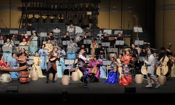 十余種不同民族的特色樂器共奏贊歌,把上海大劇院點燃成狂歡的派對現(xiàn)場。這個周末,上海民族樂團全新創(chuàng)作的《國樂詠中華》音樂會迎來全球首演。周六和周日兩天的音樂會分別由指揮家湯沐海、樂團駐團指揮姚申申執(zhí)棒,也拉開樂團2021-2022全新演出季的序幕。在今晚舉行的音樂會尾聲,全場所有演奏家?guī)怼对俪礁杞o黨聽》,這首歌曲是由才旦卓瑪?shù)膶W生、藏族青年歌唱家索朗旺姆創(chuàng)作的,并由作曲家王云飛進行了民樂版本的編曲,掌聲應和著動聽的旋律,將音樂會氛圍推向高潮。
