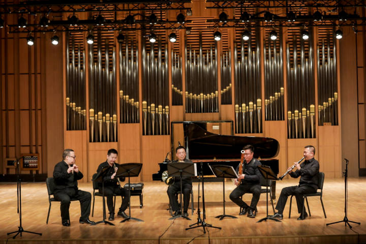 樂隊學(xué)院、室內(nèi)樂學(xué)院學(xué)子率先奏響了弦樂四重奏《瑤族舞曲》、木管五重奏《唱支山歌給黨聽》;樂隊學(xué)院青年指揮胡星宇執(zhí)棒學(xué)院交響管樂團(tuán),演奏了青春洋溢、熱情似火的《茉莉花香云天外》《我的祖國》《情熱大陸》等管樂團(tuán)經(jīng)典。當(dāng)晚標(biāo)準(zhǔn)音樂廳上演 “紅色經(jīng)典——全國11所音樂學(xué)院交流音樂會”更是好戲連臺,各音樂學(xué)院推出最強(qiáng)陣容,由48位專家聯(lián)袂,以多樣化的室內(nèi)樂組合精彩演繹了藝術(shù)家心中的紅色經(jīng)典。音樂會開場由浙江音樂學(xué)院管弦系主任單簧管教授董德君與四川音樂學(xué)院、沈陽音樂學(xué)院、天津音樂學(xué)院、西安音樂學(xué)院等六位教授演奏了《三個小伙伴》,趣味橫生的精彩演繹使現(xiàn)場氣氛瞬間活躍。