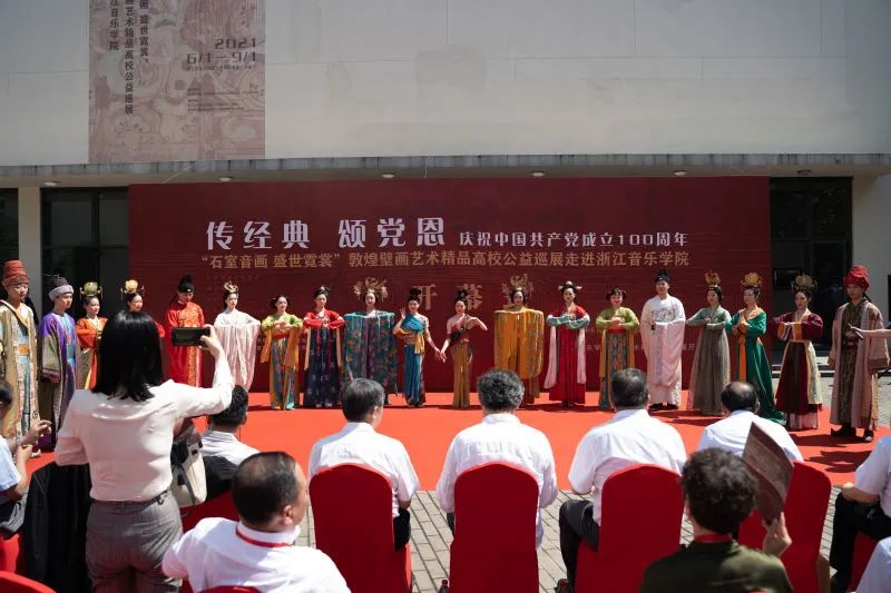2021年6月6日,“傳經(jīng)典,頌黨恩——慶祝中國共產(chǎn)黨成立100周年系列活動(dòng)”之“石室音畫,盛世霓裳——敦煌壁畫藝術(shù)精品高校公益巡展”在浙江音樂學(xué)院盛大啟幕。