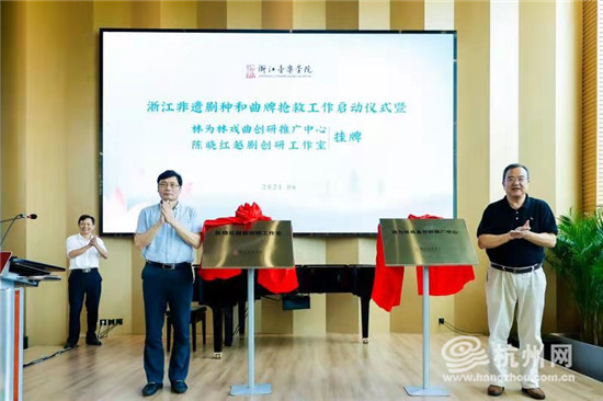 活動(dòng)儀式上,浙江省文化和旅游廳廳長(zhǎng)褚子育,浙江音樂學(xué)院黨委書記胡建新為林為林戲曲創(chuàng)研推廣中心、陳曉紅越劇創(chuàng)研工作室揭牌。