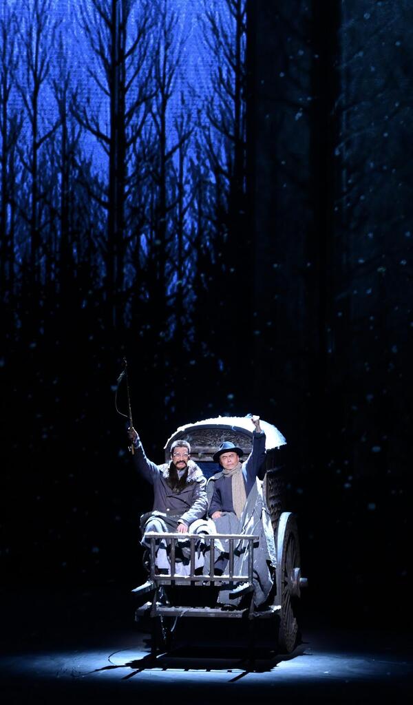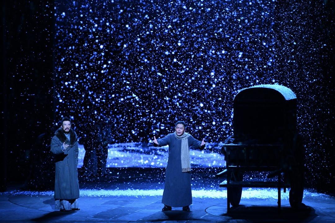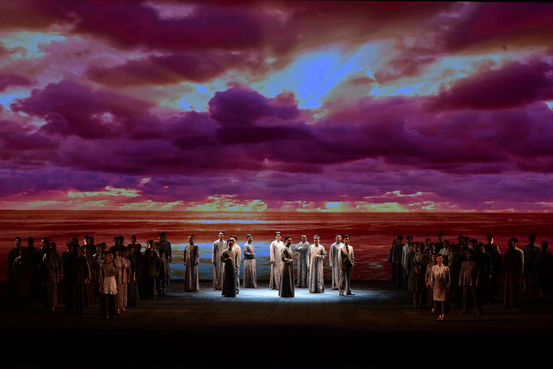 音樂是該劇的重要亮點,以行進式作為主要節(jié)奏發(fā)展,整體張力十足,既有恢宏氣勢,又有細膩柔婉。強有力的中國聲音匯聚于此,獨唱、合唱、重唱各顯神通,大調、小調、離調交替更迭,宣敘、詠敘、詠嘆運用自如,人物主題音樂鮮明,層次變化異常豐富,完美實現(xiàn)戲劇性、情感性和詩意化的表達。
