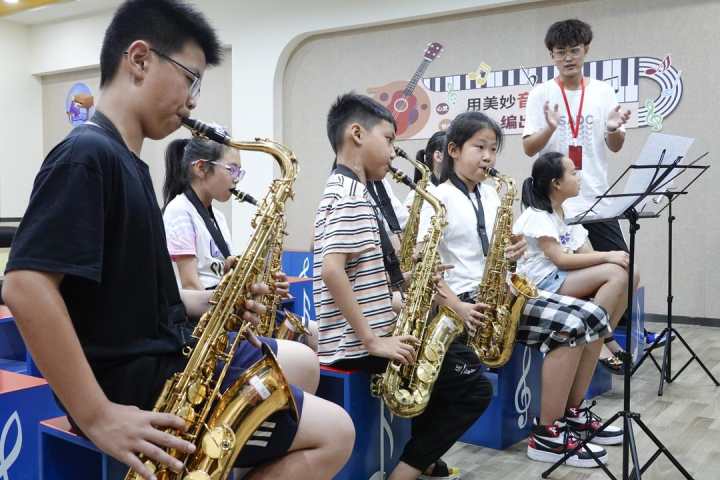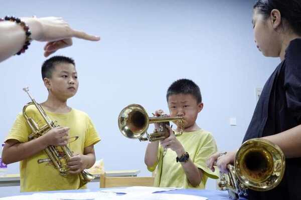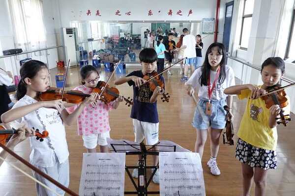 7月14日,在嘉興市秀洲區(qū)王店鎮(zhèn)建設(shè)中心小學(xué),來自浙江音樂學(xué)院“快樂音樂教室”暑期公益實(shí)踐活動(dòng)的大學(xué)生志愿者們教鄉(xiāng)村學(xué)生演奏樂器。本次公益活動(dòng)為期9天,大學(xué)生志愿者們?cè)趯W(xué)校打地鋪,為鄉(xiāng)村孩子們帶來西洋樂器教學(xué)、基礎(chǔ)樂理、音樂賞析、手工勞作、心理團(tuán)輔等課程。