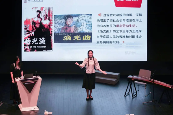配合課程內(nèi)容,講座中采用助演形式,期間有古箏彈奏、歌劇《繡紅旗》選段、《漁光曲》演唱、笛子吹奏。講師聲情并茂,通過問答的方式給與觀眾表達自我觀點的機會,加深課程的印象,激發(fā)觀眾對音樂的濃厚興趣。觀眾們凝神傾聽,時而激憤,時而感動,小劇場內(nèi)掌聲不斷。大家在音樂的鑒賞中更加深切體會到我黨百年征程的艱難困苦,感慨幸福生活得來不易,音樂的無窮魅力,也進一步共情了我們?nèi)祟愖非笞杂?、幸福生活的熱切期望?/p>