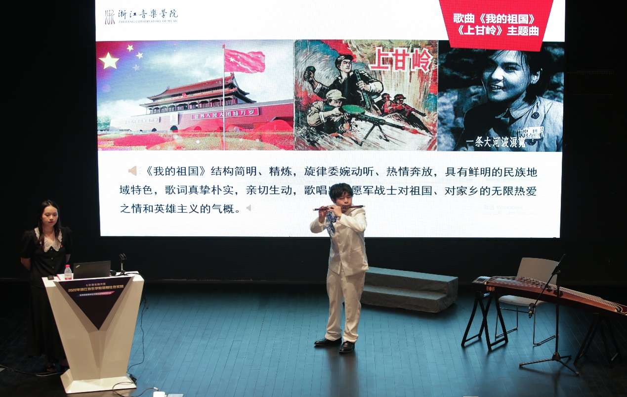 浙音師生以紅色音樂作品為主打,與地方優(yōu)秀的理論宣講員合作,形成具有地域特色的音樂黨課。在余姚,師生配合余姚“舜江青語”理論宣講聯(lián)盟的青年宣講員,慷慨激昂地奏響了《第一交響序曲》;在臨平,師生與“新時(shí)代臨平青年說”宣講團(tuán)合作《愛在吳越山水之間》等3部精彩的宣講作品,博得觀眾的陣陣叫好聲。