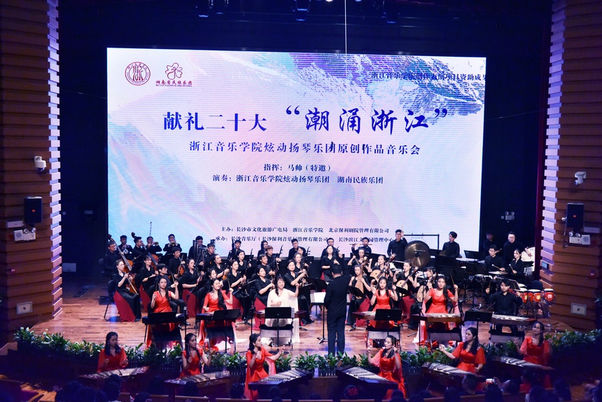 “水光瀲滟晴方好,山色空蒙雨亦奇”,恰如其分地描繪了江南的山川秀美、人杰地靈。8月27日,一支來自美麗杭州的學生樂團——浙江音樂學院炫動揚琴樂團,用揚琴這種悠揚的傳統(tǒng)樂器,將“淡妝濃抹總相宜”的江南美景與詩意,帶到湖南長沙人民身邊。當晚,獻禮二十大 “潮涌浙江”——浙江音樂學院炫動揚琴樂團原創(chuàng)作品音樂會在長沙音樂廳驚艷亮相,由浙江音樂學院炫動揚琴樂團與湖南民族樂團聯(lián)袂演出,中央音樂學院青年指揮家馬帥擔任指揮。本次演出的所有曲目均為知名作曲家、浙江音樂學院作曲與指揮系副教授王云飛委約創(chuàng)作,借助帶有浙江氣質的詩書畫意象,展現(xiàn)浙江的深厚底蘊和發(fā)展活力。