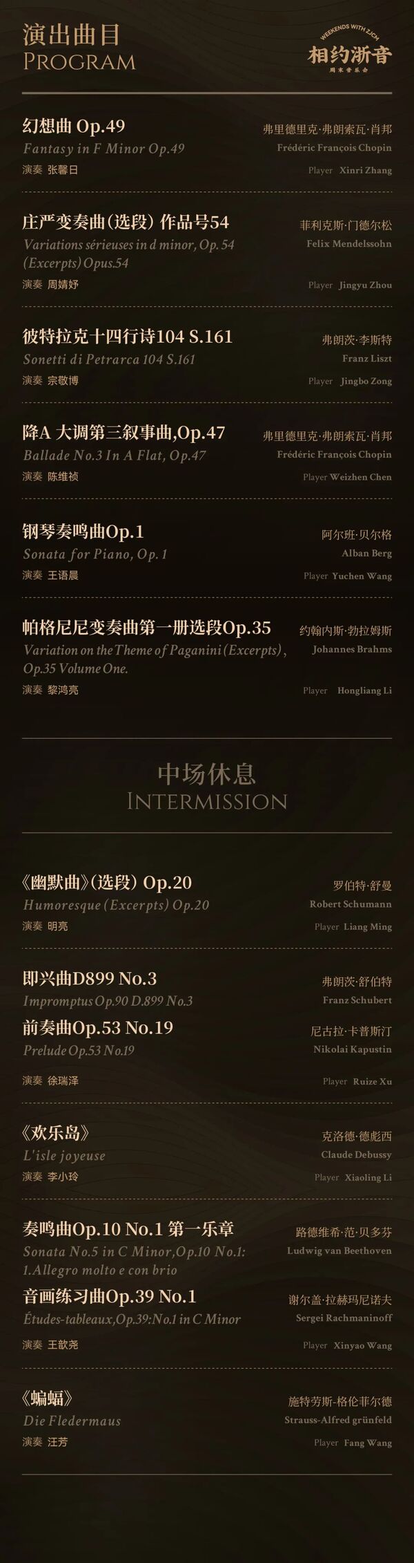此次音樂會涵蓋不同時期多種風(fēng)格,包括古典、浪漫,以及近現(xiàn)代的優(yōu)秀鋼琴作品,其中不乏如肖邦敘事曲、貝多芬奏鳴曲等公眾耳熟能詳?shù)慕?jīng)典作品,也有貝爾格第一鋼琴奏鳴曲、卡普斯汀前奏曲等別具特色的作品,將為廣大觀眾帶來一場精彩的鋼琴盛宴。