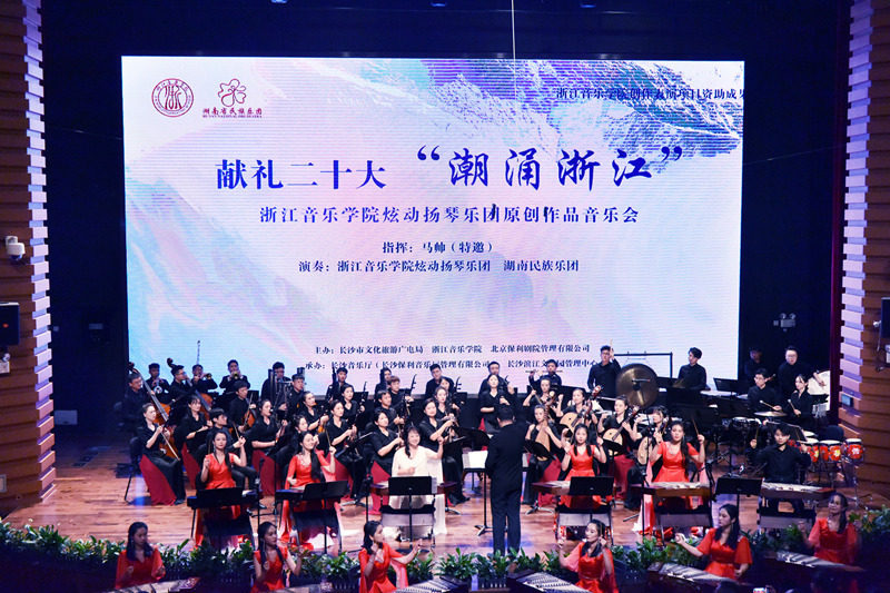 8月27日晚,獻禮二十大 “潮涌浙江”——浙江音樂學院炫動揚琴樂團原創(chuàng)作品音樂會在長沙音樂廳驚艷亮相,由浙江音樂學院炫動揚琴樂團與湖南民族樂團聯袂演出,中央音樂學院青年指揮家馬帥擔任指揮。本次演出的所有曲目均為知名作曲家、浙江音樂學院作曲與指揮系副教授王云飛委約創(chuàng)作,借助帶有浙江氣質的詩書畫意象,展現浙江的深厚底蘊和發(fā)展活力。