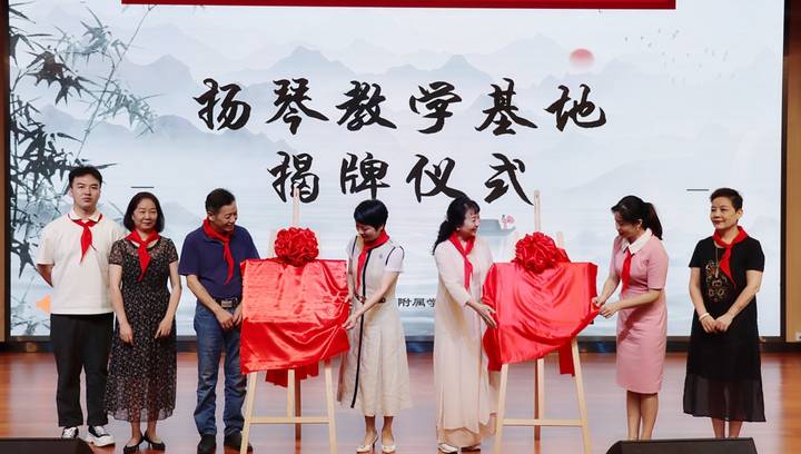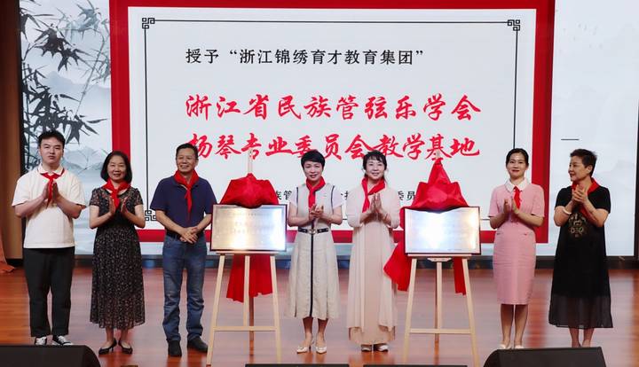 千呼萬喚始出來,在熱切的期盼中,浙江省民族管弦樂學(xué)會會長劉建寬、浙江音樂學(xué)院團(tuán)委書記徐曉昀、浙江省民族管弦樂學(xué)會副會長于海英、錦繡育才集團(tuán)小學(xué)部總校長丁杭纓一起掀開了牌匾上的紅蓋頭。浙江省民族管弦樂學(xué)會揚琴專業(yè)委員會副會長兼秘書長王慧芳 陳霞芬、浙江音樂學(xué)院國樂系學(xué)生黨支部書記薛平川和全體師生一起見證了浙江省民族管弦樂學(xué)會揚琴專業(yè)委員會教學(xué)基地的正式落成。