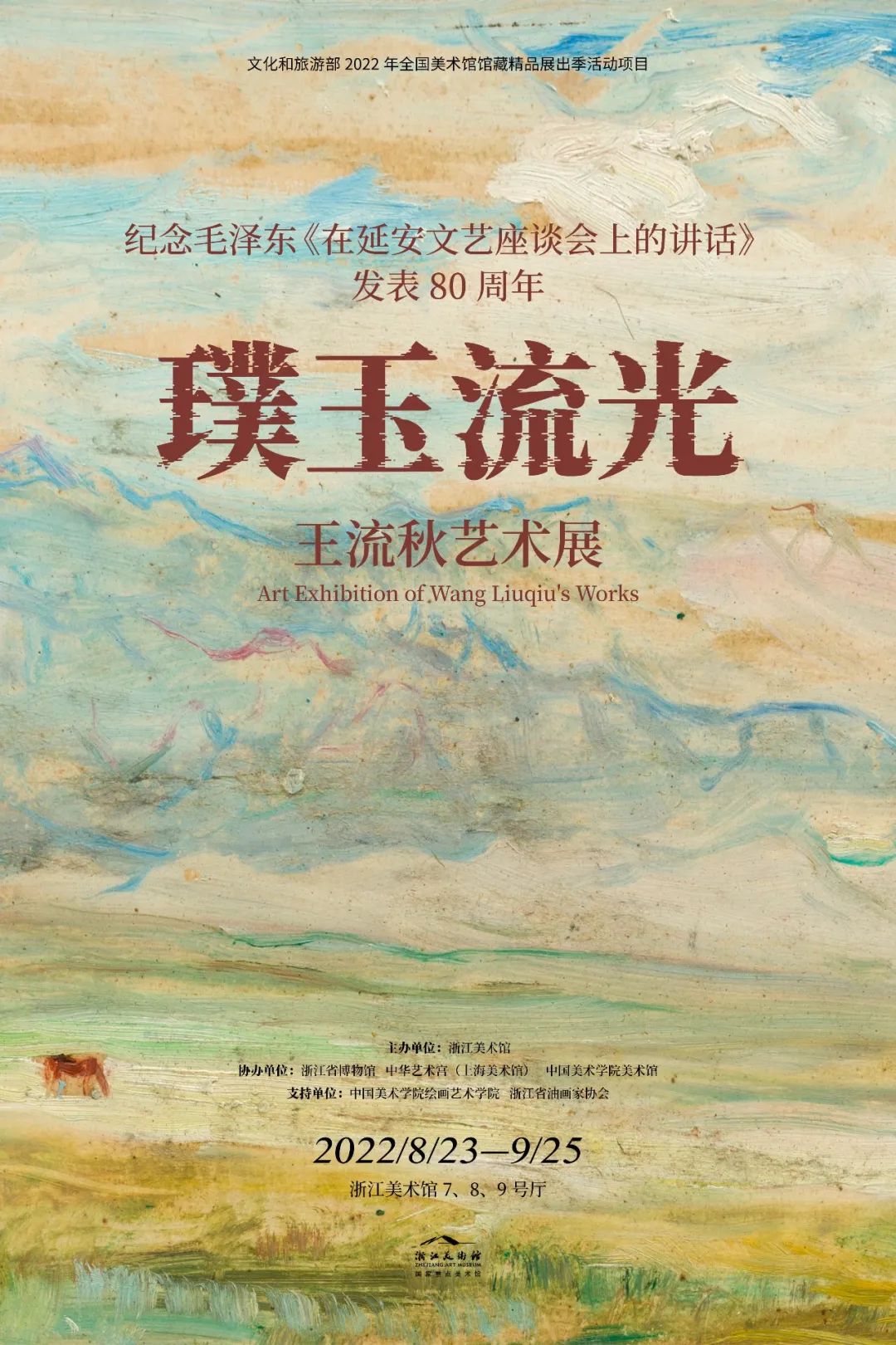 活動(dòng)簡(jiǎn)介:為紀(jì)念毛澤東《在延安文藝座談會(huì)上的講話》發(fā)表80周年,緬懷與弘揚(yáng)王流秋先生的歷史貢獻(xiàn)和藝術(shù)成就,鼓勵(lì)社會(huì)捐贈(zèng),拓展藏品征集渠道,特舉辦“璞玉流光——王流秋藝術(shù)展”,展覽列入文化和旅游部2022年度全國美術(shù)館館藏精品展出季項(xiàng)目。該展由浙江美術(shù)館主辦,浙江省博物館、中華藝術(shù)宮(上海美術(shù)館)、中國美術(shù)學(xué)院美術(shù)館協(xié)辦,展出王流秋油畫作品、文獻(xiàn)150余件(組),全面展示王流秋一生的藝術(shù)成就。