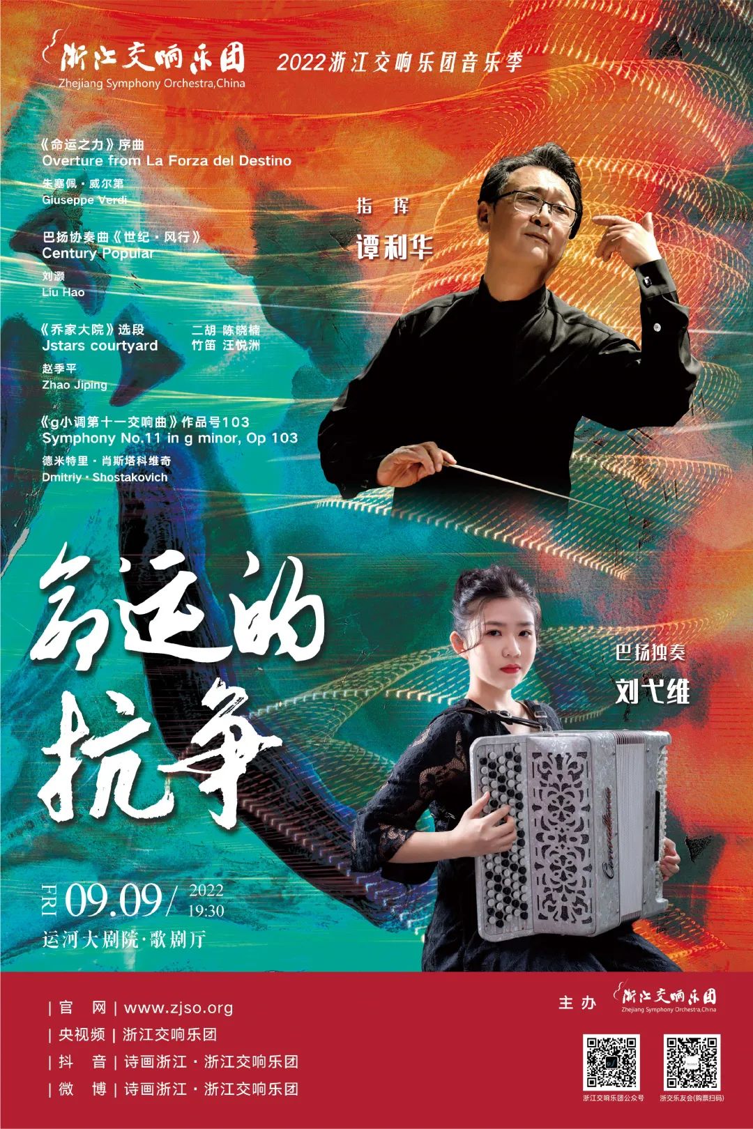 活動(dòng)簡(jiǎn)介:浙江交響樂團(tuán)將攜手著名指揮家譚利華、青年巴揚(yáng)演奏家劉弋維、二胡演奏家陳曉楠、竹笛演奏家汪悅洲帶來“命運(yùn)的抗?fàn)?rdquo;2022音樂季專場(chǎng)音樂會(huì)。本場(chǎng)音樂會(huì)將會(huì)帶來《命運(yùn)之力》序曲(威爾第)、巴揚(yáng)協(xié)奏曲《世紀(jì)·風(fēng)行》(劉灝)、《喬家大院》選段(趙季平)以及德米特里·肖斯塔科維奇《g小調(diào)第十一交響曲》(作品號(hào)103)。