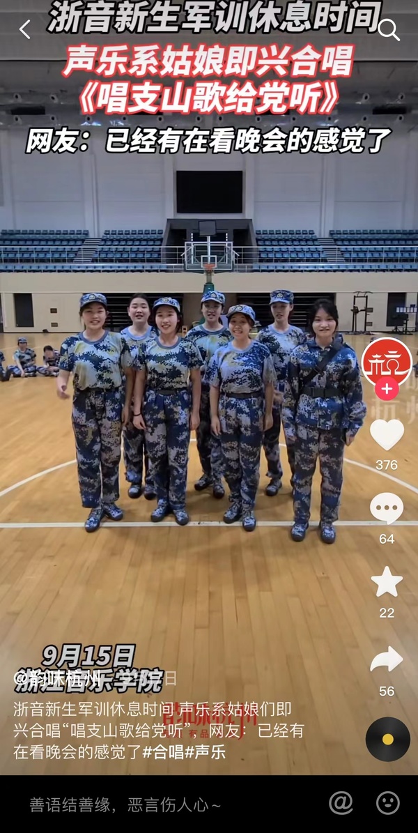 韻味杭州:浙音新生軍訓(xùn)休息時間 聲樂系姑娘們即興合唱《唱支山歌給黨聽》