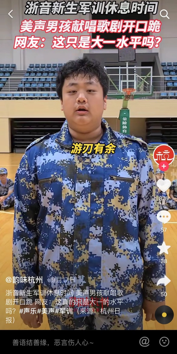 韻味杭州:浙音新生軍訓休息時間 美聲男孩獻唱歌劇開口跪