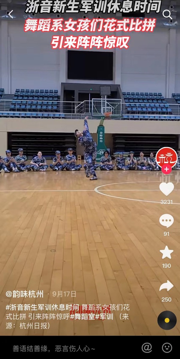 韻味杭州:浙音新生軍訓(xùn)休息時(shí)間 舞蹈系女孩們花式比拼 引來(lái)陣陣驚嘆