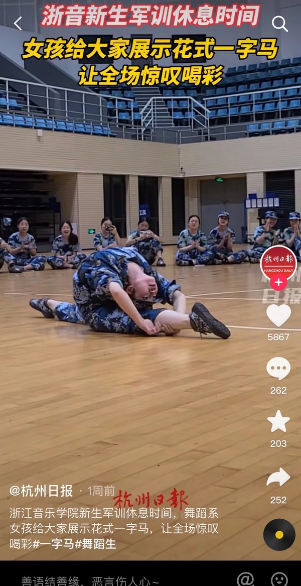杭州日?qǐng)?bào):浙江音樂學(xué)院新生軍訓(xùn)休息時(shí)間 舞蹈系女孩給大家展示花式一字馬讓全場(chǎng)驚嘆喝彩