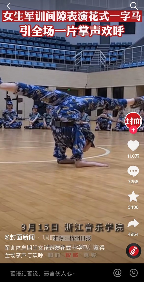 封面新聞:軍訓休息期間女孩表演花式一字馬,贏得全場掌聲與歡呼