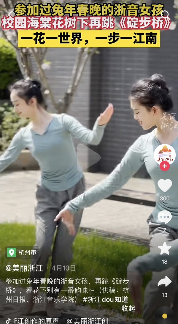 美麗浙江抖音視頻號(hào):參加過(guò)免年春晚的浙音女孩,再跳《碇步 橋》,春花下別有一番韻味