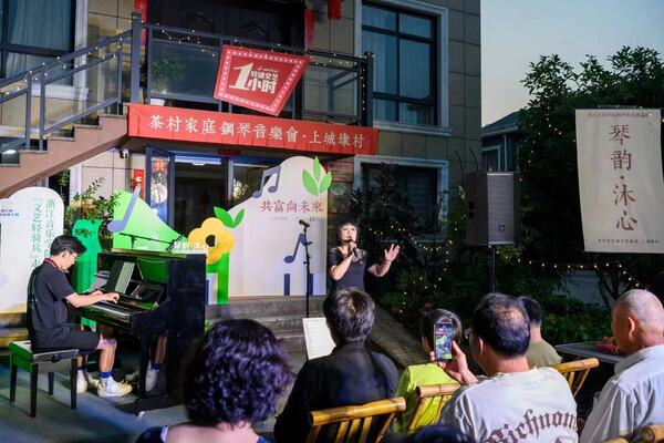 5月19日晚,暮色籠罩在茶園,一場浪漫的鋼琴音樂會,在杭州市轉(zhuǎn)塘街道上城埭村的一間庭院里啟幕。在充滿家庭氛圍的庭院內(nèi),浙江音樂學(xué)院鋼琴系“文藝輕騎兵”,將高雅藝術(shù)送到村民群眾身邊,與上城埭再次攜手共赴這場“共富”之約。