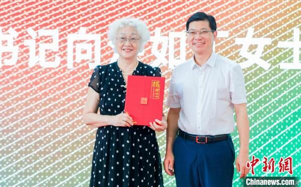 圖為浙江音樂學院黨委書記干武東向施光南夫人洪如丁頒發(fā)捐贈證書