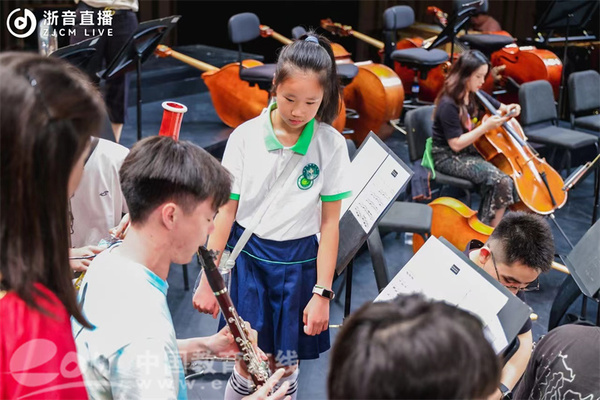 雖然孩子們一直在學習樂器,但近距離接觸整個交響樂隊還是第一次。排演時,四年級的龐然有幸站在了著名指揮家張藝身邊,體驗了一把“指揮視角”感受交響樂的動人魅力。著名指揮家張藝也親切地和小朋友們進行了對話,并給予了鼓勵。聽著恢弘的交響樂在耳邊響起,龐然激動萬分:“能有這樣一個機會,我感到非常興奮,這次體驗對我的音樂欣賞能力是一次升華,非常感謝演奏家們,未來我會向著夢想前進!”。