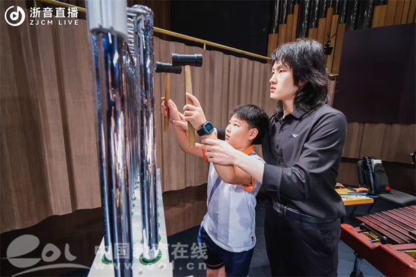 為了讓兒童更加了解交響樂、感受交響樂的美好。音樂會開始前,浙音樂隊學院還特意帶著學軍小學之江校區(qū)英雄管樂隊的小樂手們參觀演出后臺,與浙音樂隊學院學生交流,沉浸式體驗交響樂排演現(xiàn)場。