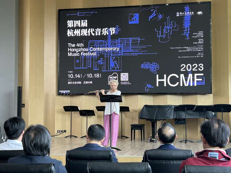 10月14日,2023第四屆杭州現(xiàn)代音樂節(jié)新聞發(fā)布會暨開幕式現(xiàn)場,柯亞娜·諾瓦科娃表演長笛獨奏《F》。 中青報·中青網(wǎng)見習記者 賈驥業(yè)/攝