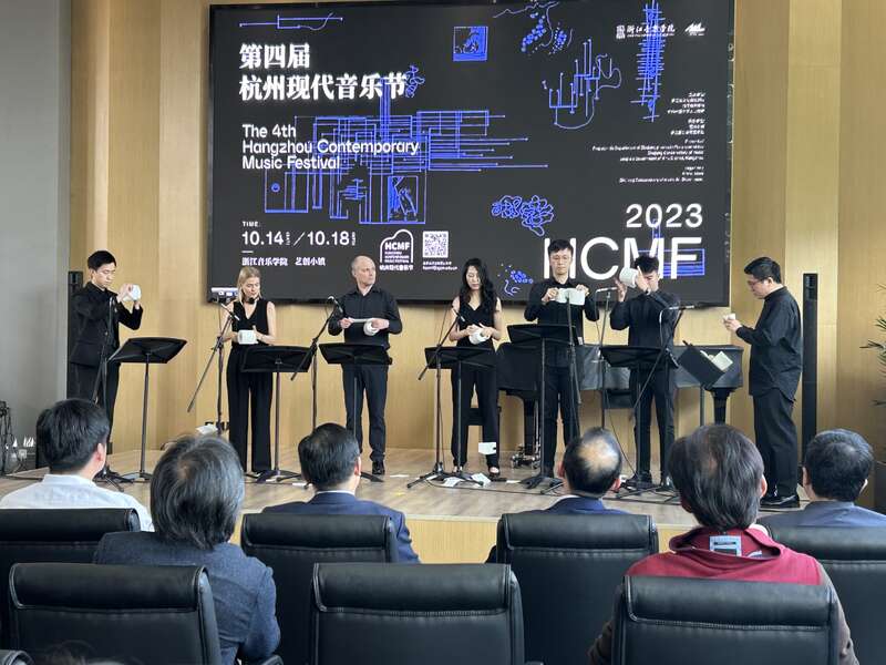 10月14日,2023第四屆杭州現(xiàn)代音樂節(jié)新聞發(fā)布會暨開幕式現(xiàn)場,香港創(chuàng)樂團用紙演奏《愛情故事》。 中青報·中青網(wǎng)見習記者 賈驥業(yè)/攝
