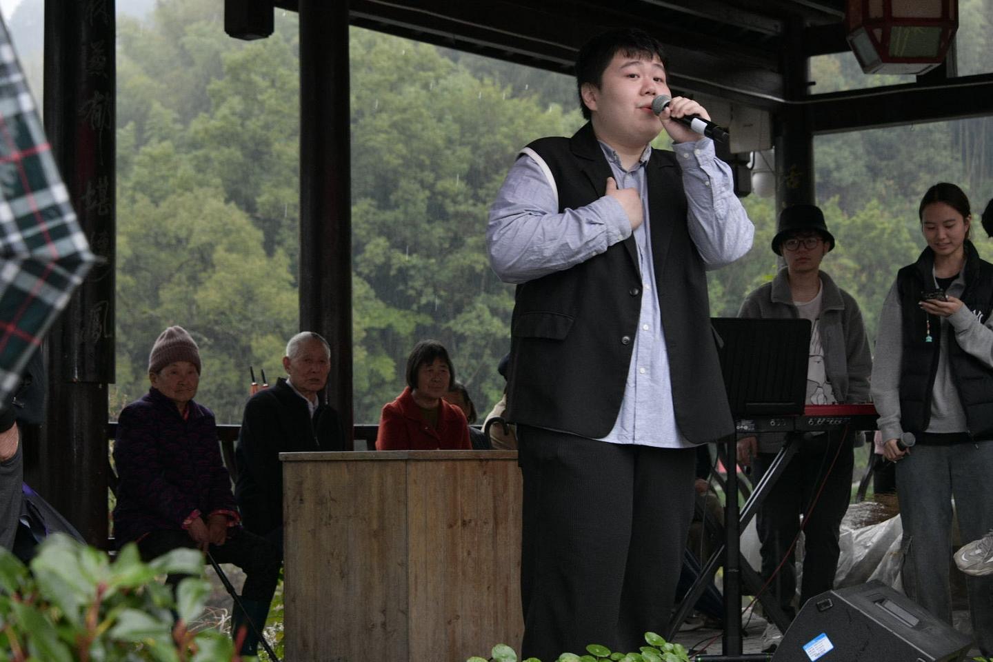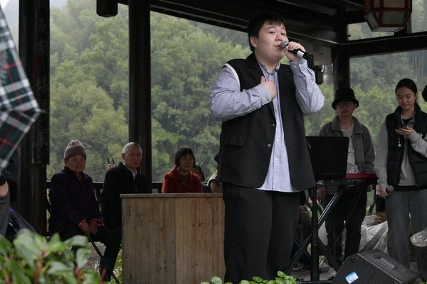 在美麗景色和“豐收節(jié)”喜慶氣氛的感染下,浙音流行音樂系學(xué)生們在下姜村廊橋廣場唱響豐收之歌,演出了器樂重奏《夜來香》《海闊天空》,歌曲《最美的太陽》《逆光》《我愛你中國》等村民百姓耳熟能詳?shù)牧餍幸魳?,傳遞出同學(xué)們探訪“紅色根脈”的真切感悟,以及祝愿鄉(xiāng)村繁榮發(fā)展的如火熱情。