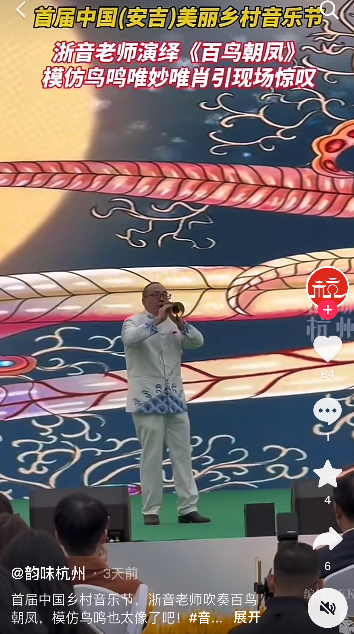 新聞來源:8.41 JII:/ O@x.sr 12/08 復(fù)制打開抖音,看看【韻味杭州的作品】首屆中國(guó)鄉(xiāng)村音樂節(jié),浙音老師吹奏百鳥朝鳳,模仿鳥鳴... https://v.douyin.com/iRGxMYvh/