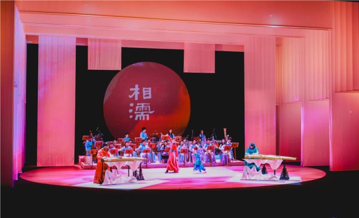 翠鳥(niǎo)鳴高枝、玉箏訴情長(zhǎng)。在作品的第三篇章《相濡》中,青翠與赤翡相遇,通過(guò)兩把古箏的訴說(shuō)和交織,展示了一雙神鳥(niǎo)相遇、相知、愛(ài)戀、離緒、相思等豐富多樣的音樂(lè)情緒,描繪出“泉涸,魚相與處于陸。相呴以濕,相濡以沫”的動(dòng)人情感。兩位優(yōu)秀的古箏演奏家通過(guò)默契地配合,將一世一雙、比翼雙飛的愛(ài)慕與心系蒼生、高地志遠(yuǎn)的情懷淋漓盡致地展現(xiàn)出來(lái)。