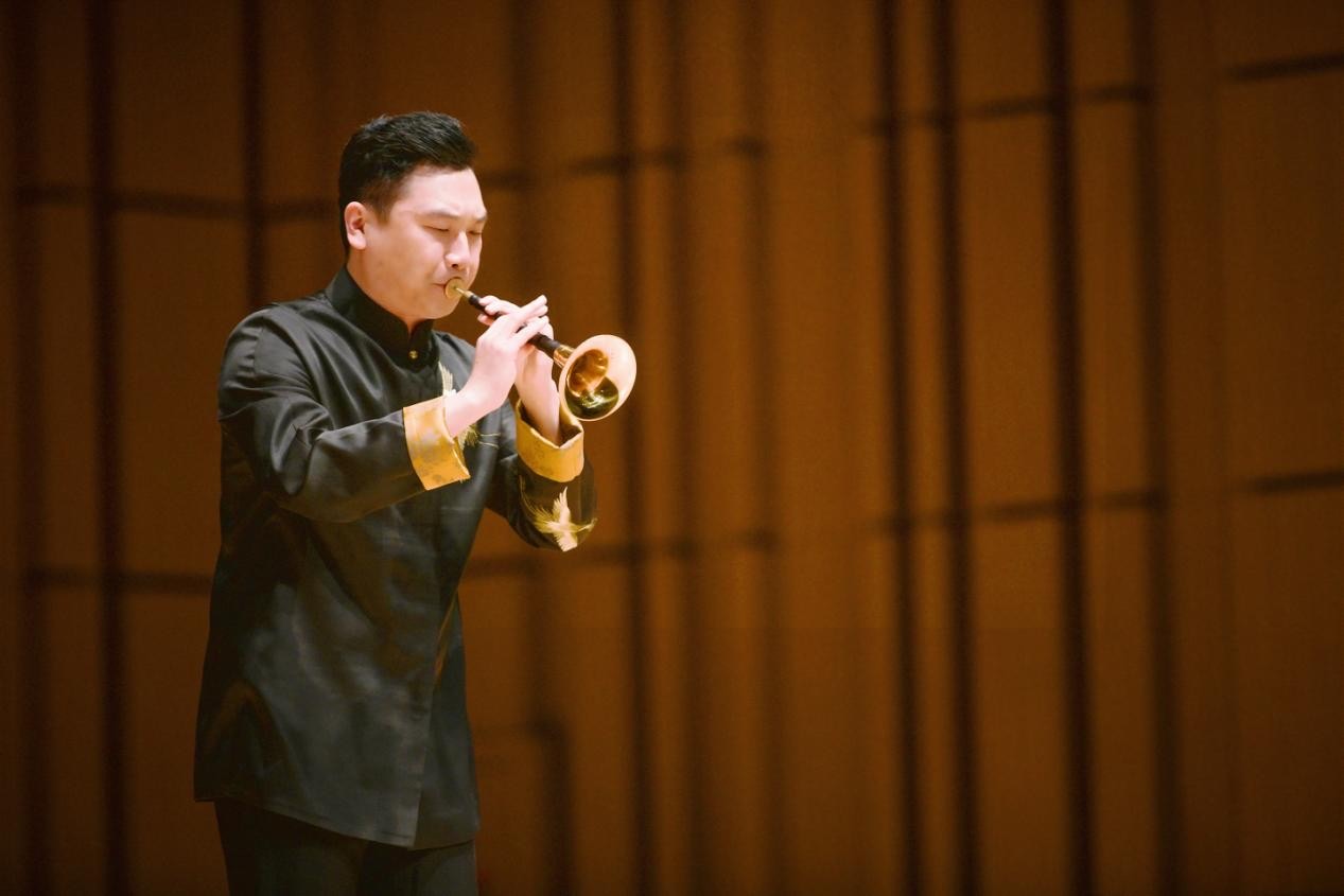 畫(huà)風(fēng)一轉(zhuǎn),浙江音樂(lè)學(xué)院國(guó)樂(lè)系學(xué)生孔海宇奏出一曲歡快質(zhì)樸的《二人轉(zhuǎn)牌子曲》,濃郁的地方風(fēng)格和強(qiáng)烈的生活氣息撲面而來(lái)。延續(xù)上一首樂(lè)曲的熱烈氣氛,音樂(lè)會(huì)迎來(lái)一個(gè)小高潮。上海音樂(lè)學(xué)院民樂(lè)系學(xué)生趙祥博演奏的《凡子調(diào)接叫句子》由流傳于安徽民間的兩段不同曲牌“凡字調(diào)”、“叫句子”組合而成,生動(dòng)再現(xiàn)了民間嗩吶對(duì)趣的場(chǎng)景。