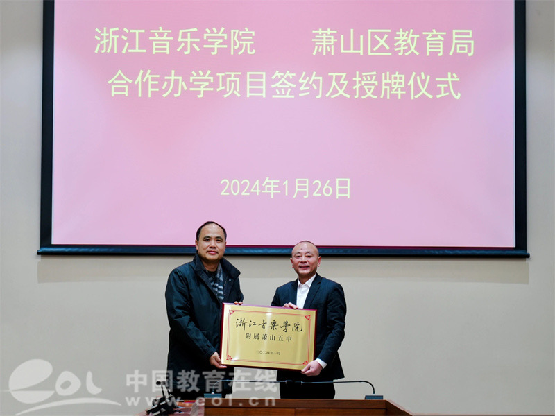會(huì)上,浙江音樂學(xué)院與蕭山區(qū)教育局簽訂合作辦學(xué)協(xié)議書,蕭山五中被授牌“浙江音樂學(xué)院附屬蕭山五中”。未來,雙方將本著“合作共贏、優(yōu)勢(shì)互補(bǔ)”的原則,共同開展區(qū)域音樂教育教學(xué)研究、學(xué)生實(shí)踐實(shí)習(xí)、藝術(shù)類課程研發(fā)等內(nèi)容,協(xié)助蕭山五中制定學(xué)校藝術(shù)發(fā)展規(guī)劃,指導(dǎo)藝術(shù)課程建設(shè)、課堂教學(xué)改革、教師培養(yǎng)和學(xué)生發(fā)展等各項(xiàng)工作,力爭通過三至五年時(shí)間,把蕭山五中辦成一所省市知名的藝術(shù)特色高中,實(shí)現(xiàn)普高學(xué)生多元發(fā)展、多途徑成才,形成合作辦學(xué)領(lǐng)域“尚學(xué)蕭山”的新范式,輻射提升蕭山整體的藝術(shù)教育水平。