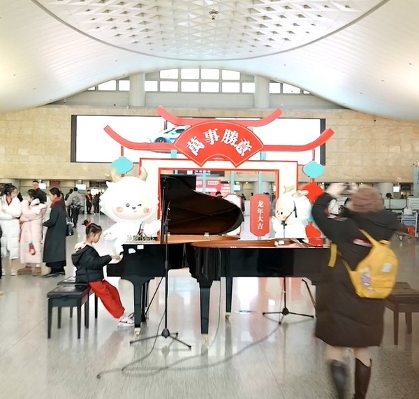 活動在充滿節(jié)日喜慶氛圍的《春節(jié)序曲》中緩緩拉開帷幕,隨后同學們帶來了《茉莉花》、《康定情歌》、《燈火里的中國》等耳熟能詳的中國作品,熟悉的旋律吸引了在場的旅客,他們紛紛放緩匆匆的腳步,駐足聆聽。近鄉(xiāng)情更怯,龔璇老師的一首《彩云追月》更是勾起了多少游子的思鄉(xiāng)之情。朱昊和吳君麟老師演奏的《黃河》鋼琴協(xié)奏曲將整場活動推向了高潮。最后一首《我和我的祖國》的熟悉旋律引發(fā)現場觀眾共鳴,在場的旅客情不自禁地齊聲合唱,共同抒發(fā)對祖國的熱愛。整場鋼琴快閃活動中,鋼琴系師生用西洋樂演奏了濃濃“中國風”,吸引眾多旅客拍照留念,共同見證這個難忘的時刻。值得一提的是,此次快閃還特別安排互動環(huán)節(jié),讓旅客們有機會與鋼琴系師生進行近距離交流和互動,共同感受鋼琴藝術的魅力。