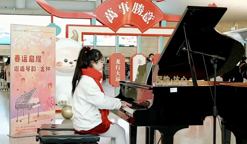在杭州蕭山國際機場,浙音鋼琴系3位曾獲中國音樂金鐘獎的青年教師朱昊、龔璇和吳君麟,帶領優(yōu)秀學子在值機大廳舉辦了“春運啟程,邂逅琴韻‘金鐘’”鋼琴快閃活動?!洞汗?jié)序曲》《茉莉花》《燈火里的中國》……耳熟能詳?shù)膭尤艘魳蜂秩境鰸鉂饽晡叮矠槿罕妭兙徑饬寺猛緞陬D、更添一份歸鄉(xiāng)情切。
