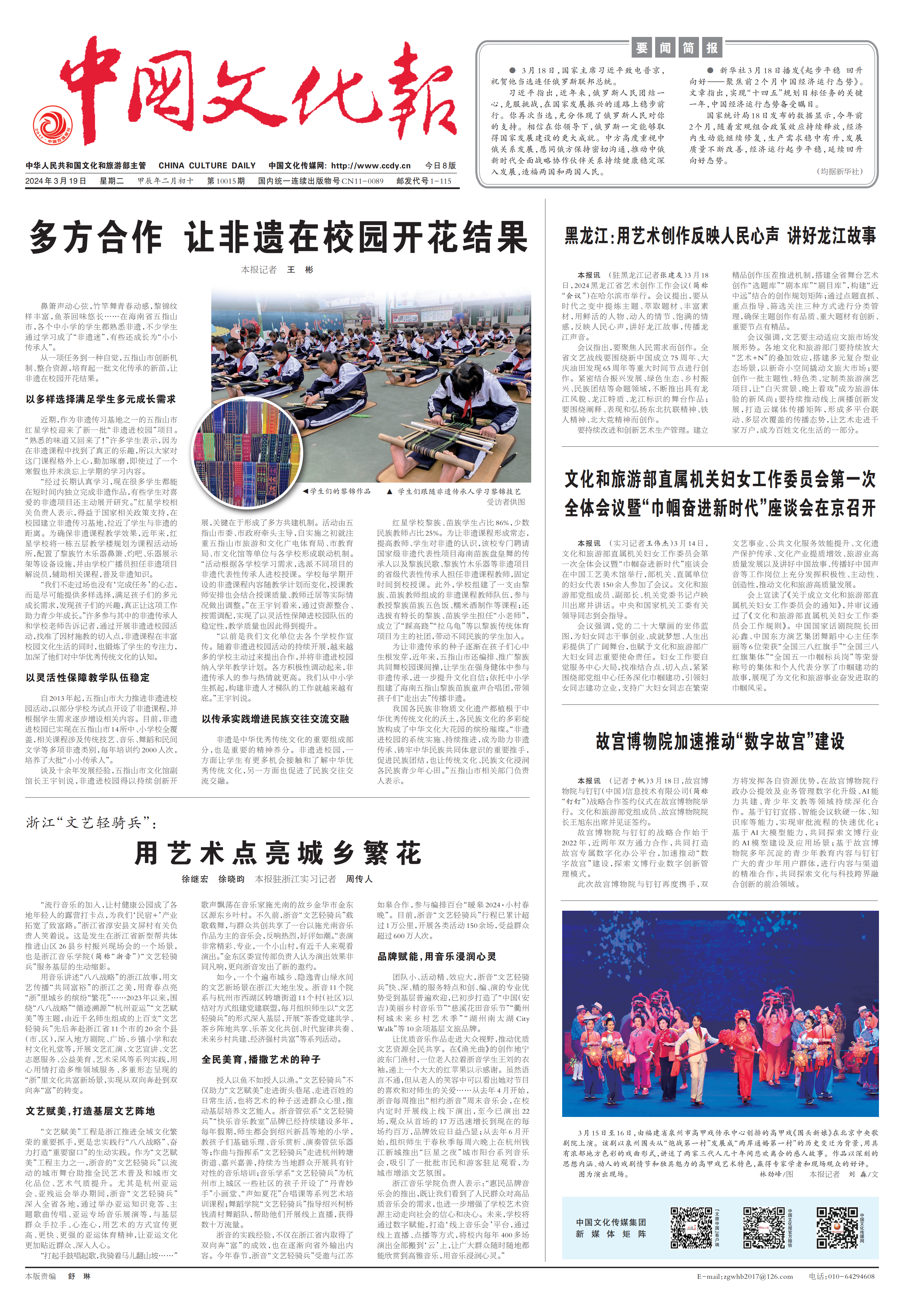 用音樂講述“八八戰(zhàn)略”的浙江故事,用文藝傳播“共同富裕”的浙江之美,用青春點(diǎn)亮“浙”里城鄉(xiāng)的繽紛“繁花”……2023年以來,圍繞“八八戰(zhàn)略”“循跡溯源”“杭州亞運(yùn)”“文藝賦美”等主題,由近千名師生組成的上百支“文藝輕騎兵”先后奔赴浙江省11個(gè)市的20余個(gè)縣(市、區(qū)),深入地方劇院、廣場(chǎng)、鄉(xiāng)鎮(zhèn)小學(xué)和農(nóng)村文化禮堂等,開展文藝匯演、文藝宣講、文藝志愿服務(wù)、公益美育、藝術(shù)采風(fēng)等系列實(shí)踐,用心用情打造多維領(lǐng)域服務(wù)、多重形態(tài)呈現(xiàn)的“浙”里文化共富新場(chǎng)景,實(shí)現(xiàn)從雙向奔赴到雙向奔“富”的轉(zhuǎn)變。