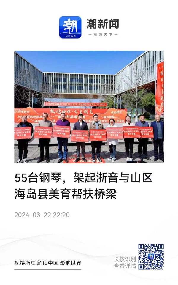 浙江音樂學院相關(guān)負責人表示,浙音將在此次捐贈基礎(chǔ)上,與山區(qū)海島縣共建鄉(xiāng)土音樂教室、藝術(shù)實踐基地,定期派遣“文藝輕騎兵”赴各地開展文藝演出、藝術(shù)實踐、名師課堂等,讓高雅藝術(shù)融入鄉(xiāng)村,激活地方文化活力。