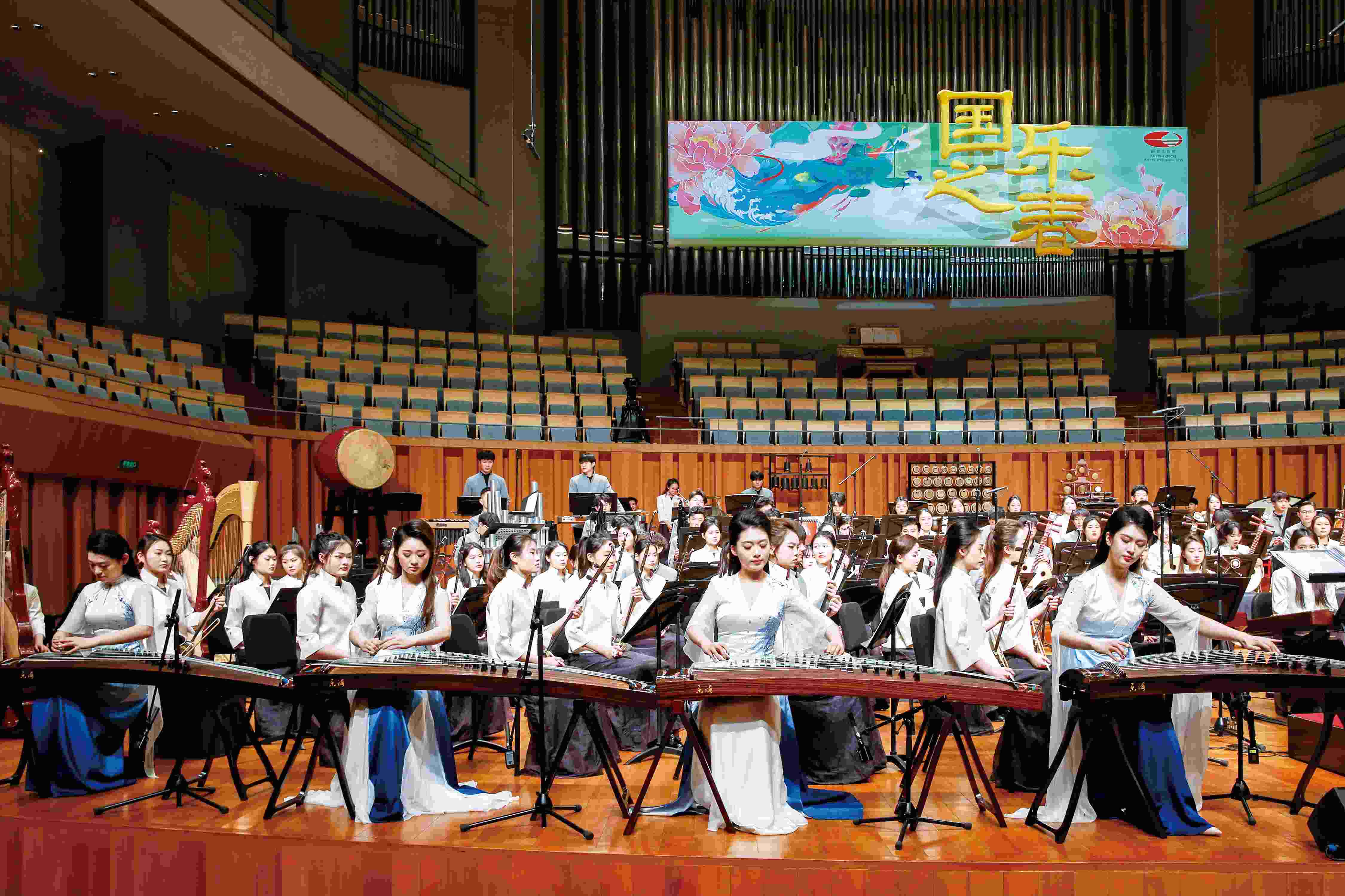 韶光向暖,芳菲正盛,弦樂鏗鏘,笙管齊鳴。4月11日晚,浙江音樂學院民族樂隊學院組成的大型民族樂團來到北京國家大劇院,參加第二屆“國樂之春”民族音樂節(jié)。本場音樂會為觀眾呈現(xiàn)多部富有中國氣派、浙江特色的民族管弦樂新作和經(jīng)過重新編配的經(jīng)典作品,謳歌新時代祖國大地欣欣向榮、蓬勃發(fā)展的萬千氣象,以“大樂”之音韻奏響中華民族現(xiàn)代文明之“永和”,也把浙江音樂學院的發(fā)展改革成果及當代青年對民族音樂傳承發(fā)展的思考呈現(xiàn)給首都觀眾。