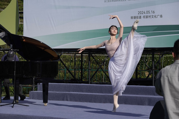 音樂會上,火遍全網(wǎng)的青年舞蹈家、浙江音樂學(xué)院教授劉福洋作為何家村的“藝術(shù)村長”,與浙江音樂學(xué)院教授陳瓊共同演繹了鋼琴和舞蹈節(jié)目《鴻雁》。舞姿悠揚(yáng),琴聲空靈,觀眾們紛紛沉醉在醇美的旋律中。